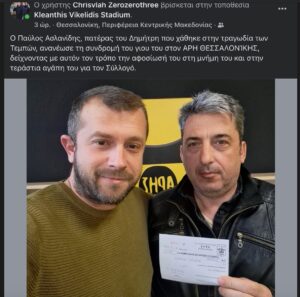 Ο πατέρας του Παύλος τίμησε τη μνήμη του γιου του και την αφοσίωσή του στο σύλλογο, προχωρώντας στην ανανέωση της συνδρομής του αδικοχαμένου νεαρού στα Τέμπη.
