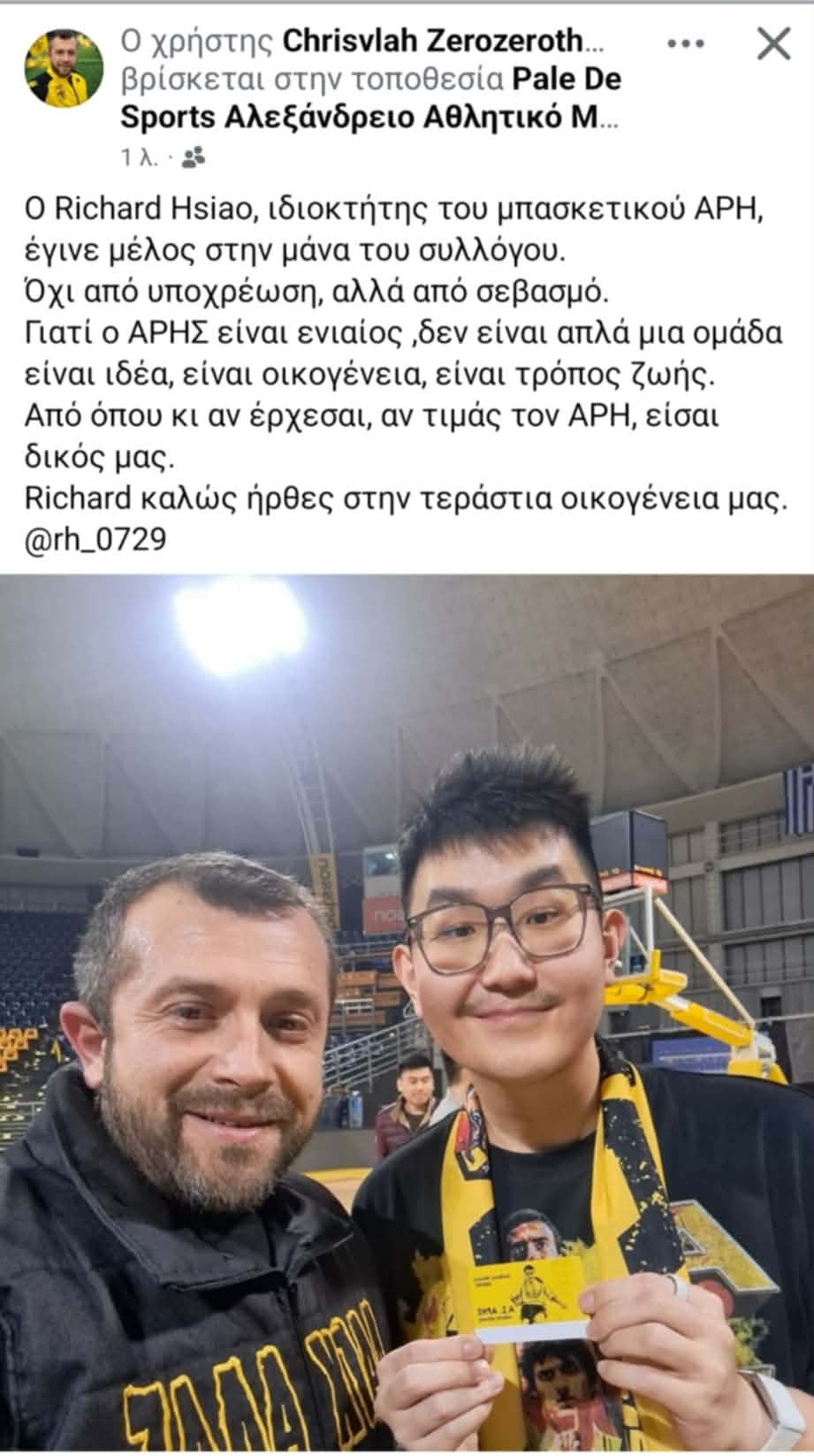 “ΕΝΑΣ ΑΠΟ ΕΜΑΣ… Από σήμερα και με κάθε επισημότητα, ο Richard Hsiao, ιδιοκτήτης του μπασκετικού ΑΡΗ και επικεφαλής της μεγάλης προσπάθειας αναγέννησης της ομάδας που ένωσε όλους τους Έλληνες σε μία ιαχή και σε μία κοινή πίστη, και σύντομα θα το ξανακάνει, εντάσσεται στην οικογένειά μας και είναι πλέον ένας από εμάς.