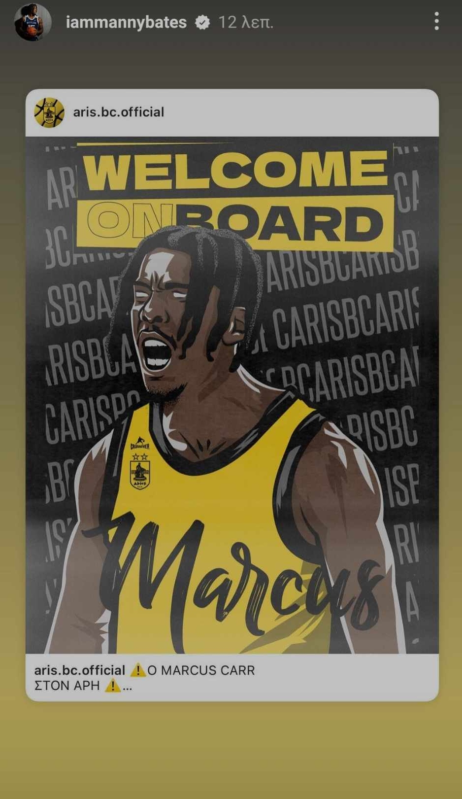 O Mάνι Μπέιτς έκανε αναδημοσίευση στο προφίλ του την ανάρτηση της ΚΑΕ για την απόκτηση του Μάρκους Καρ δείχνοντας την χαρά του για την νέα μεταγραφική απόκτηση του Αυτοκράτορα.