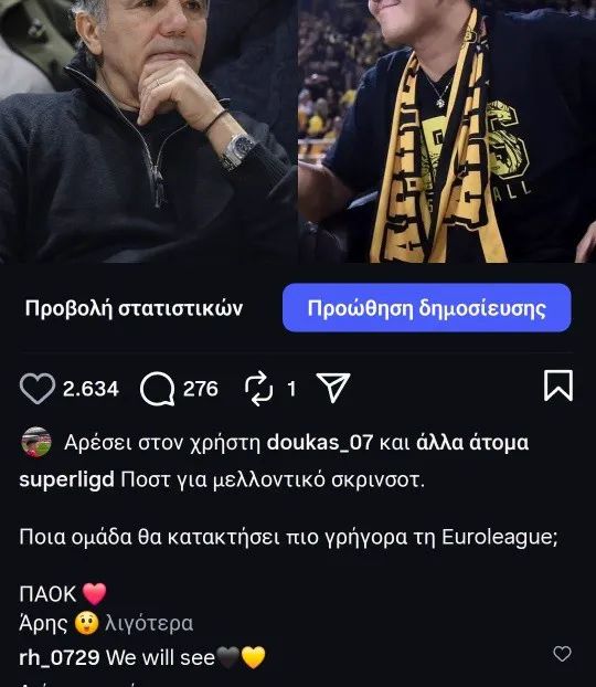 Σελίδα στο instagram έκανε γκάλοπ για την κατάκτηση της Euroleague, έχοντας σε φωτογραφία τους Μυστακίδη και Σιάο. Ο ιδιοκτήτης του ΑΡΗ φαίνεται πως σιγά σιγά μπαίνει στο… πετσί του Αρειανού αφού απάντησε ο ίδιος λέγοντας: «Θα δούμε…» Μία κίνηση ομολογουμένως που δεν μας είχε συνηθίσει ο Ρίτσαρντ Σιάο, που ίσως να δείχνει τις προθέσεις του για το μέλλον του ΑΡΗ Betsson.
