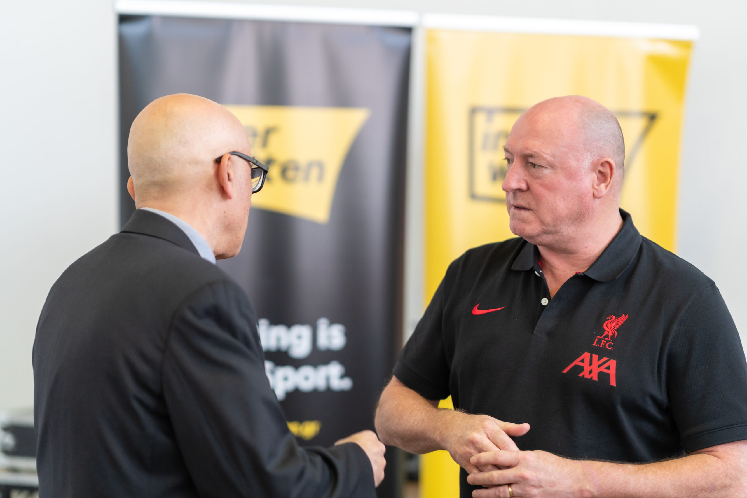 Ο Πρόεδρος της Πανελλήνιας Λέσχης Φίλων Liverpool, Γιάννης Σκοτίδας (αριστερά), συνομιλεί με τον Steve McMahon, Liverpool Legend (δεξιά)